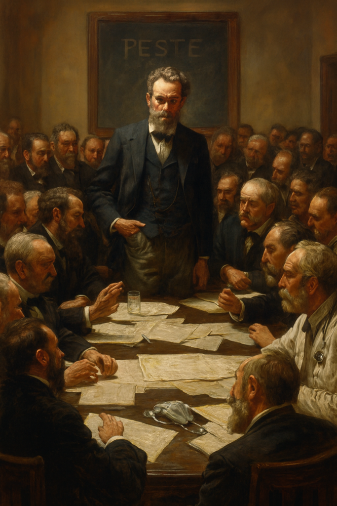 Los colegas del Dr. Rieux llaman a una reunión de urgencia; varios doctores estaban atendiendo enfermos con los mismos síntomas que tuvo el portero del Dr. Rieux. El gremio discutía cómo combatir esta nueva enfermedad; el Dr. Rieux sabía entonces de qué se trataba, como todos los médicos de la ciudad, solo que nadie tenía el valor de decirlo. De un momento a otro, la cantidad de muertos subió de golpe, por lo que se declaró el estado de alarma y se cerraron las entradas y salidas de la ciudad.